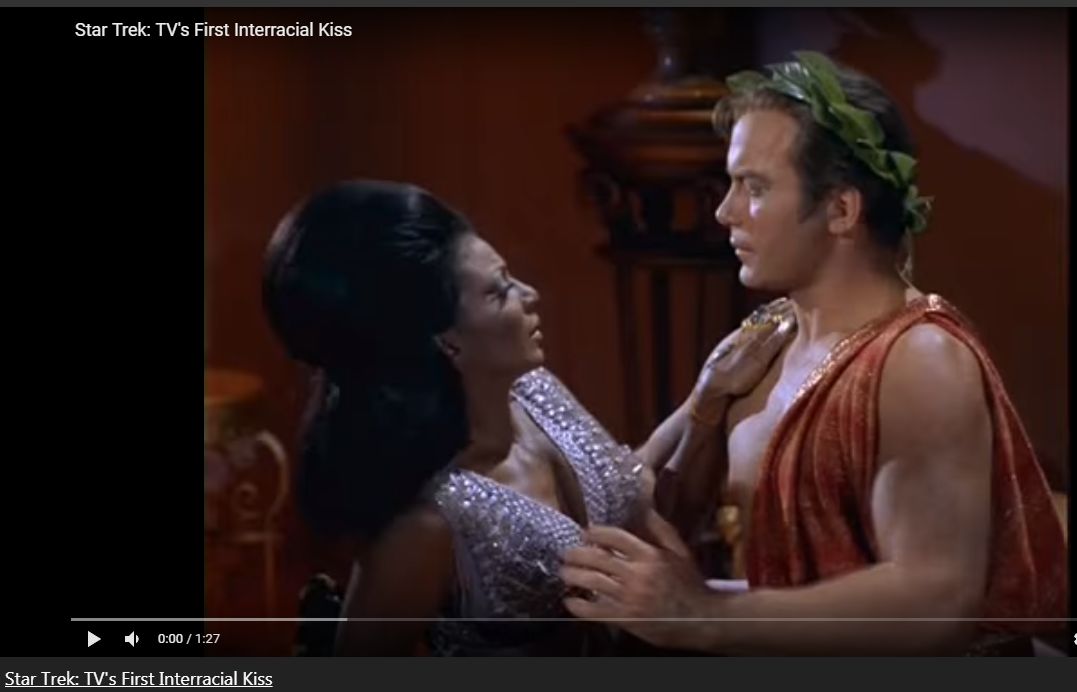 Promotion of racial mixing by Zionic mass-media hails from several decades ago, with the first kiss between Captain Kirk and Lieutenant Uhura. Since then vehemently insinuated into commonplace, particularly in pornography (that is over 90% controlled by Zionists now, just as between the world wars), what was so taboo at the time had been diffusingly buffered and couched with historical role-play garb.